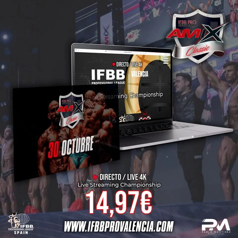 Ahora vas a poder ver el campeonato de fitness y culturismo AMIX CLASSIC sin tener que desplazarte de la comodidad de tu hogar. IFBB PRO VALENCIA te lo retransmite para que no te pierdas detalle.
