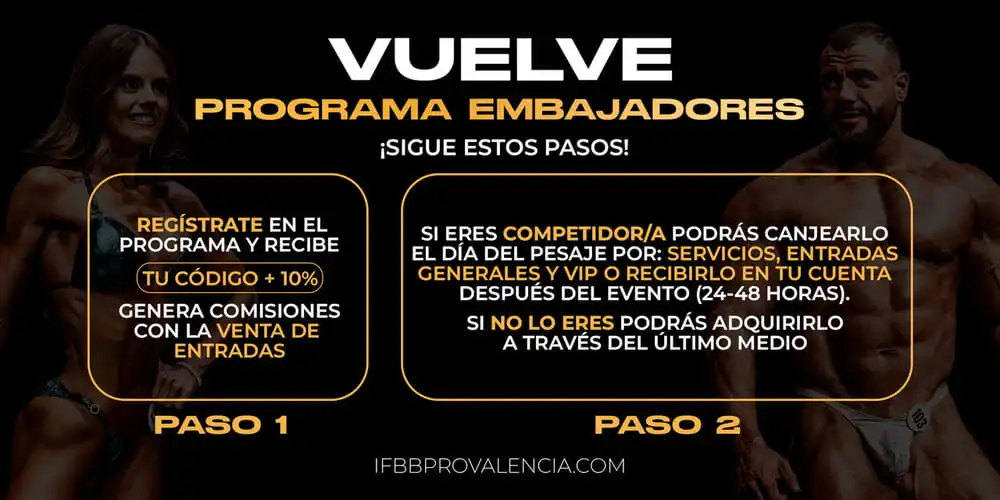 Forma parte del Programa de Embajadores IFBBPROVALENCIA, una iniciativa dirigida a atletas y asistentes que desean participar y obtener beneficios exclusivos.